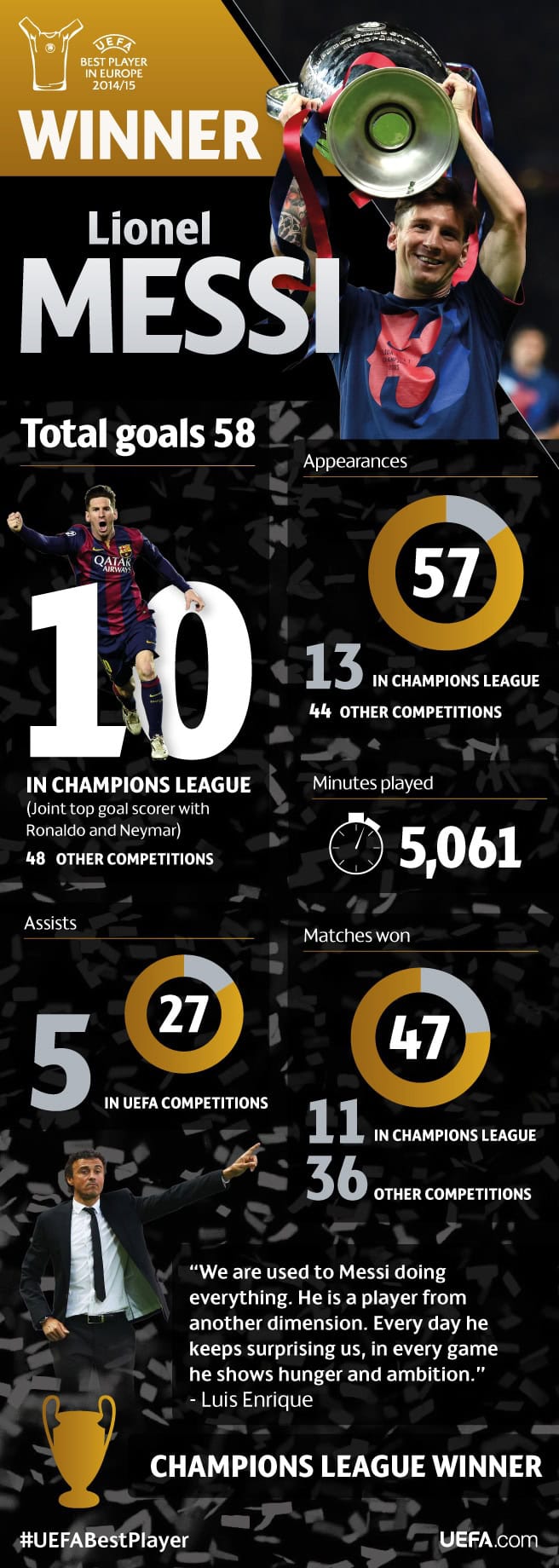 Not a big surprise to see Barcelona’s Lionel Messi be named the UEFA Best Player in Europe Award on Thursday ahead of Cristiano Ronaldo and Luis Suárez. This is the second time that Messi has won the award.